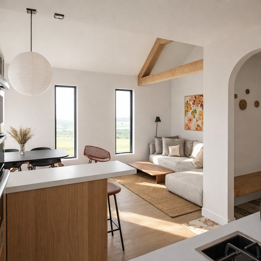 Ce T3 confortable à l’étage offre un cadre intime et agréable, avec deux chambres et deux salles d’eau. La cuisine équipée est ouverte sur un salon / salle à manger lumineux, idéal pour se retrouver au calme. Chaque chambre est aménagée avec des lits simples modulables pour s’adapter à vos besoins.